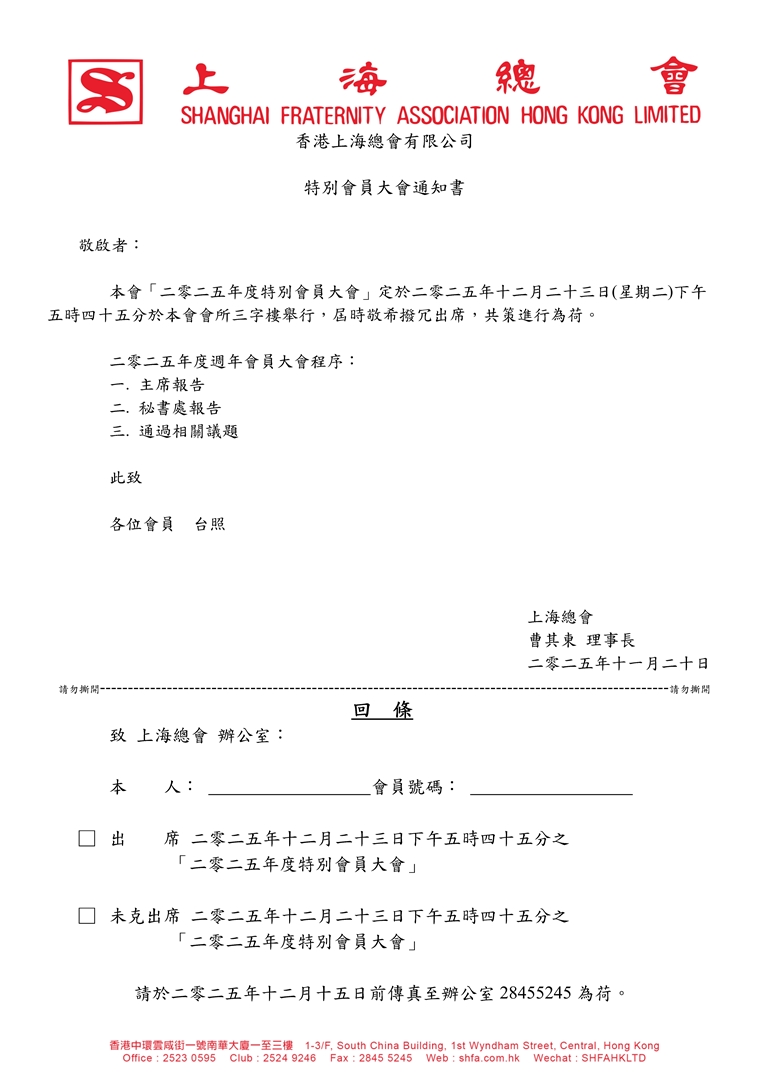 特別會員大會日期:2025-12-23(二)時間:5:45pm地點:上海總會三字樓附件請點擊閱覽:01.1 - 2025特別會員大會通知及回條02 - Table of comparison03 - M&A (final)
